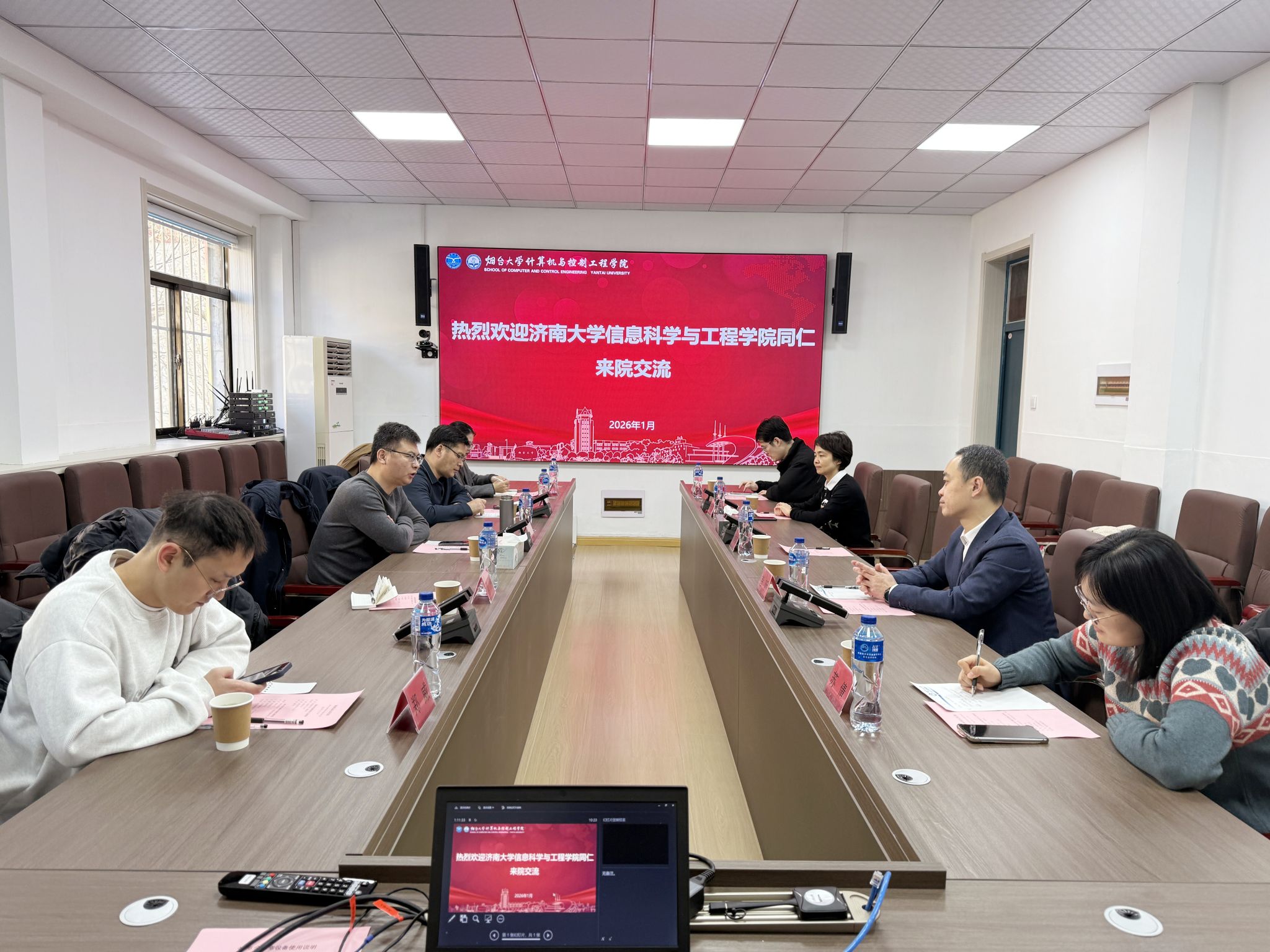 在烟台大学和鲁东大学的调研中,郝伟一行先后走访了计算机类相关实验室、学生创新创业基地,实地了解了学科平台建设与人才培养环境。座谈交流环节,双方聚焦党建与业务协同机制、思政教育模式创新、共青团工作品牌培育、科技竞赛组织与经费保障、学生日常管理优化及就业指导体系完善等议题进行了充分研讨。郝伟介绍了学院在构建“科创+就业”服务双平台方面的进展,分享了学风建设与实践育人融合的特色做法,并学习了两校在“党建赋能学科竞赛”“项目驱动创新能力培养”等方面的有效经验。与会人员还围绕学生科创竞赛长效性机制建设、毕业生就业结构性优化与路径拓展等问题开展了深入交流。